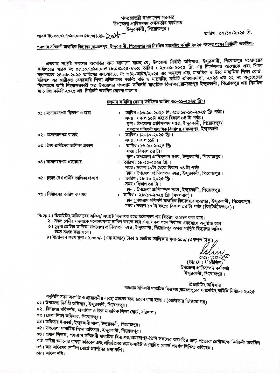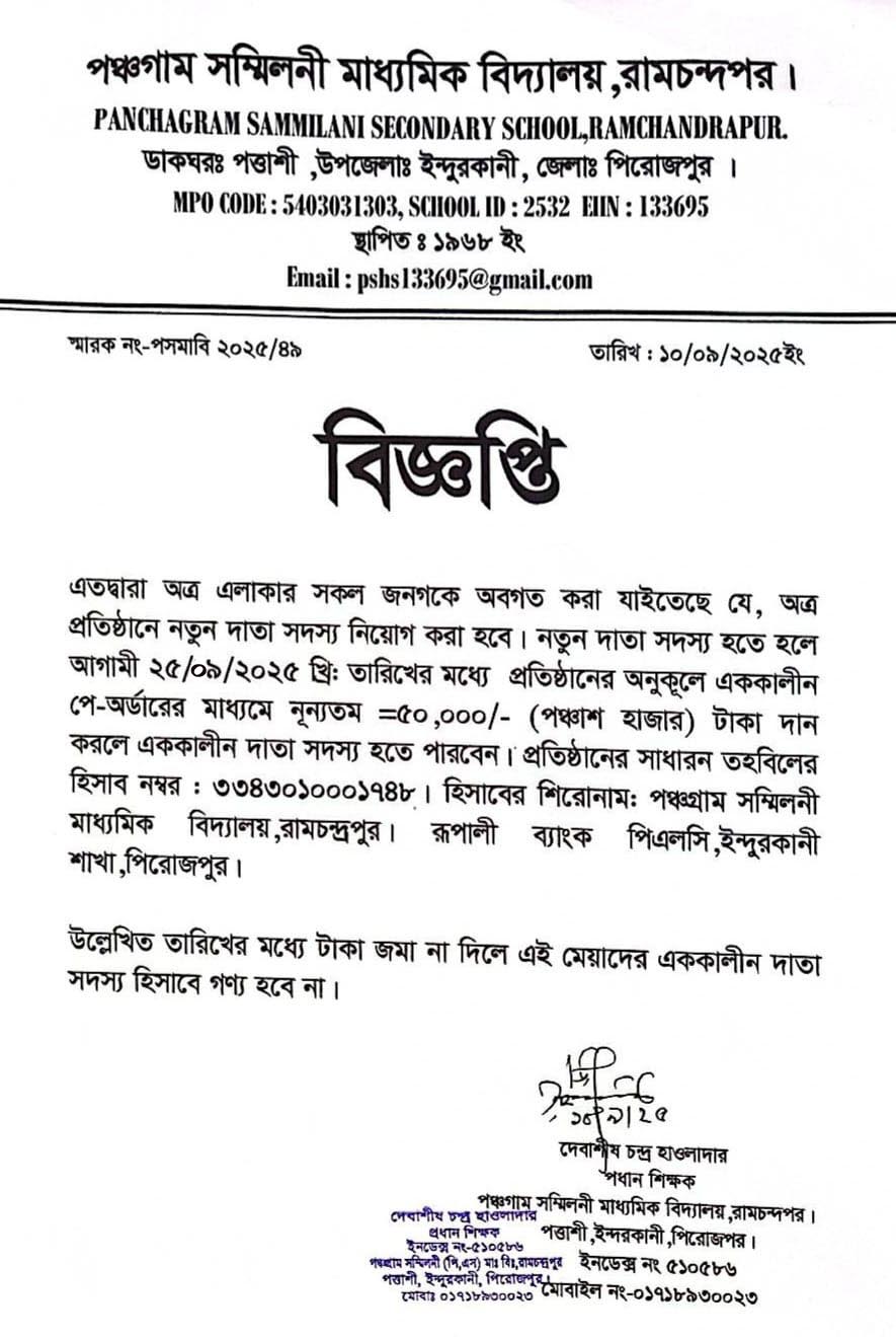 অত্র প্রতিষ্ঠানে ম্যানেজিং কমিটিতে দাতা সদস্য নিয়োগের জন্য আগামী ২৫-০৯-২০২৫ খ্রি. তারিখের মধ্যে প্রতিষ্ঠানের অনুকুলে এককালীন ৫০,০০০/- টাকার পে-অর্ডার জমা দিয়ে ফরম সংগ্রহ করার আহবান করা যাচ্ছে।